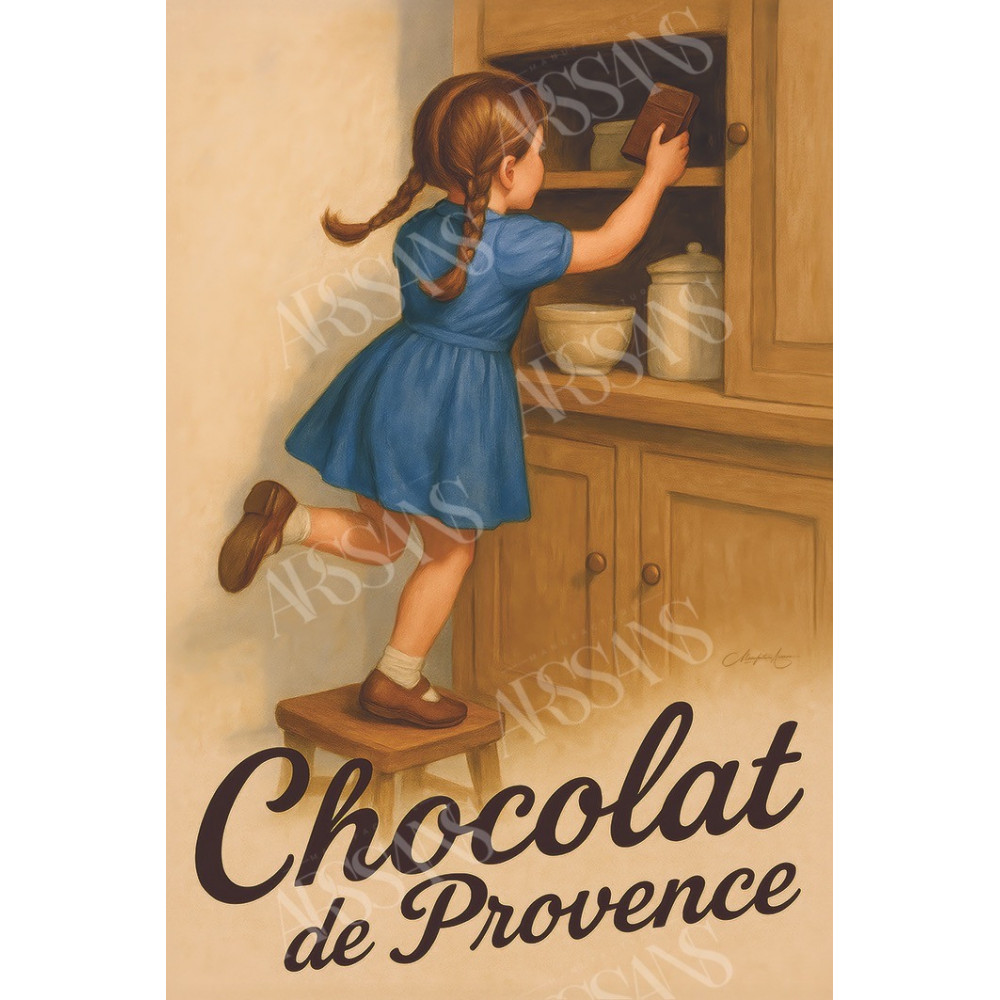 Diese liebevoll illustrierte Szene erinnert an einen süßen Moment aus der Kindheit: Ein kleines Mädchen balanciert auf einem Hocker und greift nach der geheim versteckten Tafel Schokolade im Küchenschrank. Mit geflochtenen Zöpfen und blauem Kleid verkörpert sie die unschuldige Neugier jener Jahre, in denen Schokolade ein verbotenes Abenteuer war. Dieser Magnet fängt mit nostalgischem Charme das Gefühl von Geborgenheit, Genuss und Provenzalischer Lebensart ein – perfekt für Ihre Küche oder als Geschenk!