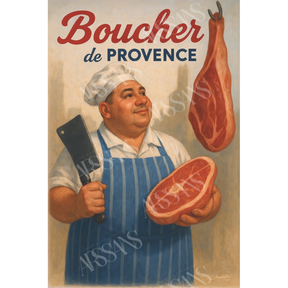 Mit gestreifter Schürze und ehrlichem Blick verkörpert der Metzger der Provence handwerkliche Tradition und die herzliche Nähe des Dorflebens.