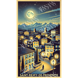 Das Poster fängt mit poetischer Sensibilität die besondere Atmosphäre der Sommernächte des Südens ein: die warme Luft, den Duft der Gärten und die friedliche Stille der schlafenden Dörfer. Am Horizont zeichnen sich die Alpilles im sanften Hell-Dunkel ab – als Wächter der natürlichen und mystischen Schönheit der Provence.