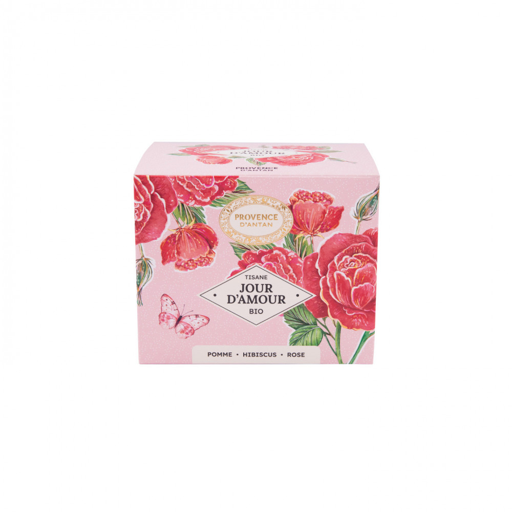 La tisane Jour D'amour est composée de Pomme, hibiscus, reglisse, rose, gingembre, cannelle, extrait de citron, extrait de rose, sarriette et romarin. Elle est 100% isuue de l'agriculture biologique.