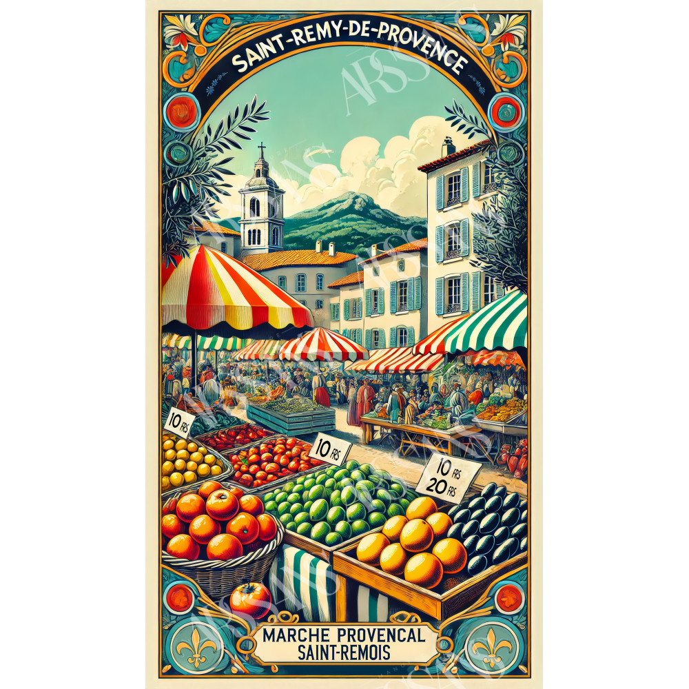 Sous les halles colorées de Saint-Rémy, les étals débordent de fruits, de légumes et d’accents chantants. Ce visuel signé Manufacture Arssans capture l’âme du marché provençal, entre convivialité, authenticité et art de vivre ensoleillé.